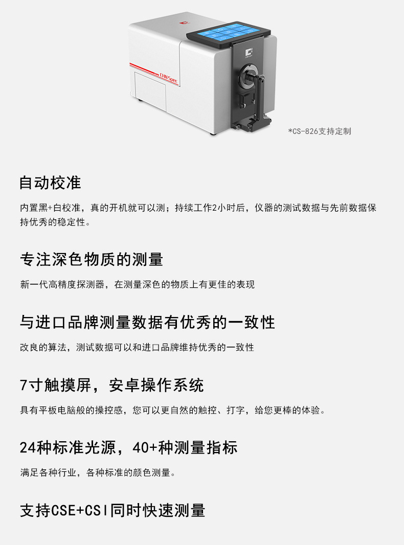 高精度臺(tái)式分光測色儀CS-826是一款高精度、高穩(wěn)定性的顏色測量儀器;先進(jìn)的工藝技術(shù),強(qiáng)大的數(shù)據(jù)處理器,讓CS-826在黑色物體的顏色測量上具有優(yōu)秀的表現(xiàn);儀器的自動(dòng)校準(zhǔn),保證了長期測量的穩(wěn)定性;改善的照明光源,在測量熒光和可見光上都有驚艷的展現(xiàn),且儀器測量數(shù)據(jù)能與進(jìn)口品牌維持優(yōu)秀的一致性。